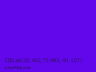 CIELab 35.492,75.983,-91.107 Color is a normal violet color and the nearest color is Electric Indigo #6f00ff. Hex code #6207eb and RGB value is rgb(98,7,235). In RGB color space, this color is composed of 38% red, 3% green, 92% blue, In CMYK color space, this color is composed of 58% cyan, 97% magenta, 0% yellow , 8% black , In HSL color space, this color has a hue angle of 264° , 94% saturation and 47% lightness.
