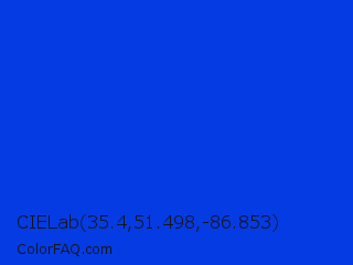 CIELab 35.4,51.498,-86.853 Color is a normal blue color and the nearest color is Blue RYB #0247fe. Hex code #043be3 and RGB value is rgb(4,59,227). In RGB color space, this color is composed of 2% red, 23% green, 89% blue, In CMYK color space, this color is composed of 98% cyan, 74% magenta, 0% yellow , 11% black , In HSL color space, this color has a hue angle of 225° , 97% saturation and 45% lightness.