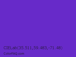 CIELab 35.511,59.483,-71.48 Color is a normal violet color and the nearest color is Purple Heart Crayola #652dc1. Hex code #672ac9 and RGB value is rgb(103,42,201). In RGB color space, this color is composed of 40% red, 16% green, 79% blue, In CMYK color space, this color is composed of 49% cyan, 79% magenta, 0% yellow , 21% black , In HSL color space, this color has a hue angle of 263° , 65% saturation and 48% lightness.