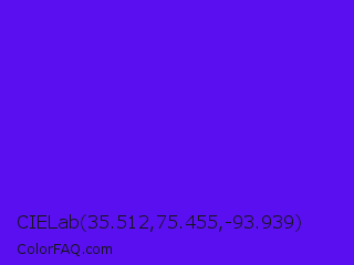 CIELab 35.512,75.455,-93.939 Color is a normal indigo color and the nearest color is Han Purple #5218fa. Hex code #590ff0 and RGB value is rgb(89,15,240). In RGB color space, this color is composed of 35% red, 6% green, 94% blue, In CMYK color space, this color is composed of 63% cyan, 94% magenta, 0% yellow , 6% black , In HSL color space, this color has a hue angle of 260° , 88% saturation and 50% lightness.