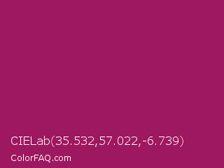 CIELab 35.532,57.022,-6.739 Color is a normal rose color and the nearest color is Jazzberry Jam #a50b5e. Hex code #9e1860 and RGB value is rgb(158,24,96). In RGB color space, this color is composed of 62% red, 9% green, 38% blue, In CMYK color space, this color is composed of 0% cyan, 85% magenta, 39% yellow , 38% black , In HSL color space, this color has a hue angle of 328° , 74% saturation and 36% lightness.