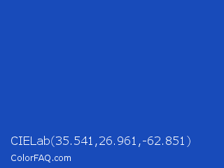 CIELab 35.541,26.961,-62.851 Color is a normal blue color and the nearest color is Sapphire #0f52ba. Hex code #184bba and RGB value is rgb(24,75,186). In RGB color space, this color is composed of 9% red, 29% green, 73% blue, In CMYK color space, this color is composed of 87% cyan, 60% magenta, 0% yellow , 27% black , In HSL color space, this color has a hue angle of 221° , 77% saturation and 41% lightness.