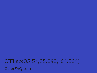 CIELab 35.54,35.093,-64.564 Color is a normal blue color and the nearest color is Violet Blue #324ab2. Hex code #3845bd and RGB value is rgb(56,69,189). In RGB color space, this color is composed of 22% red, 27% green, 74% blue, In CMYK color space, this color is composed of 70% cyan, 63% magenta, 0% yellow , 26% black , In HSL color space, this color has a hue angle of 234° , 54% saturation and 48% lightness.