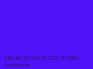 CIELab 35.554,76.232,-97.849 Color is a normal indigo color and the nearest color is Han Purple #5218fa. Hex code #4f11f7 and RGB value is rgb(79,17,247). In RGB color space, this color is composed of 31% red, 7% green, 97% blue, In CMYK color space, this color is composed of 68% cyan, 93% magenta, 0% yellow , 3% black , In HSL color space, this color has a hue angle of 256° , 93% saturation and 52% lightness.