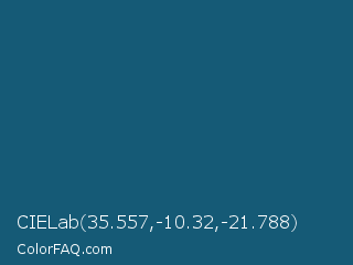 CIELab 35.557,-10.32,-21.788 Color is a dark blue color and the nearest color is Blumine #18587a. Hex code #155a76 and RGB value is rgb(21,90,118). In RGB color space, this color is composed of 8% red, 35% green, 46% blue, In CMYK color space, this color is composed of 82% cyan, 24% magenta, 0% yellow , 54% black , In HSL color space, this color has a hue angle of 197° , 70% saturation and 27% lightness.