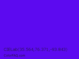 CIELab 35.564,76.371,-93.843 Color is a normal violet color and the nearest color is Han Purple #5218fa. Hex code #5c0af0 and RGB value is rgb(92,10,240). In RGB color space, this color is composed of 36% red, 4% green, 94% blue, In CMYK color space, this color is composed of 62% cyan, 96% magenta, 0% yellow , 6% black , In HSL color space, this color has a hue angle of 261° , 92% saturation and 49% lightness.