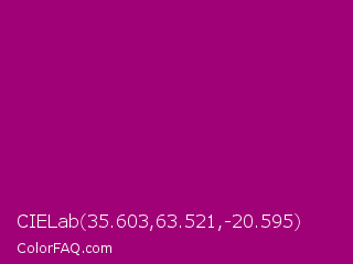 CIELab 35.603,63.521,-20.595 Color is a normal magenta color and the nearest color is Flirt #a2006d. Hex code #a00176 and RGB value is rgb(160,1,118). In RGB color space, this color is composed of 63% red, 0% green, 46% blue, In CMYK color space, this color is composed of 0% cyan, 99% magenta, 26% yellow , 37% black , In HSL color space, this color has a hue angle of 316° , 99% saturation and 32% lightness.