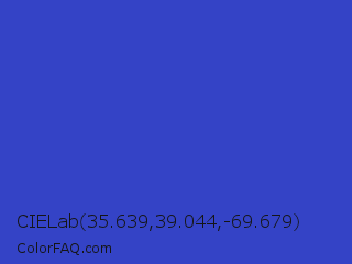 CIELab 35.639,39.044,-69.679 Color is a normal blue color and the nearest color is Cerulean Blue #2a52be. Hex code #3443c6 and RGB value is rgb(52,67,198). In RGB color space, this color is composed of 20% red, 26% green, 78% blue, In CMYK color space, this color is composed of 74% cyan, 66% magenta, 0% yellow , 22% black , In HSL color space, this color has a hue angle of 234° , 58% saturation and 49% lightness.