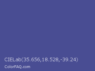 CIELab 35.656,18.528,-39.24 Color is a normal blue color and the nearest color is Victoria #534491. Hex code #494d93 and RGB value is rgb(73,77,147). In RGB color space, this color is composed of 29% red, 30% green, 58% blue, In CMYK color space, this color is composed of 50% cyan, 48% magenta, 0% yellow , 42% black , In HSL color space, this color has a hue angle of 237° , 34% saturation and 43% lightness.