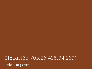 CIELab 35.705,26.458,34.259 Color is a normal orange color and the nearest color is Russet #80461b. Hex code #85411d and RGB value is rgb(133,65,29). In RGB color space, this color is composed of 52% red, 25% green, 11% blue, In CMYK color space, this color is composed of 0% cyan, 51% magenta, 78% yellow , 48% black , In HSL color space, this color has a hue angle of 21° , 64% saturation and 32% lightness.