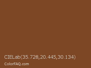 CIELab 35.728,20.445,30.134 Color is a normal orange color and the nearest color is Russet #80461b. Hex code #7d4624 and RGB value is rgb(125,70,36). In RGB color space, this color is composed of 49% red, 27% green, 14% blue, In CMYK color space, this color is composed of 0% cyan, 44% magenta, 71% yellow , 51% black , In HSL color space, this color has a hue angle of 23° , 55% saturation and 32% lightness.