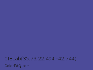 CIELab 35.73,22.494,-42.744 Color is a normal indigo color and the nearest color is Victoria #534491. Hex code #4c4b99 and RGB value is rgb(76,75,153). In RGB color space, this color is composed of 30% red, 29% green, 60% blue, In CMYK color space, this color is composed of 50% cyan, 51% magenta, 0% yellow , 40% black , In HSL color space, this color has a hue angle of 241° , 34% saturation and 45% lightness.