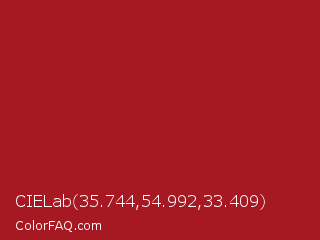 CIELab 35.744,54.992,33.409 Color is a normal red color and the nearest color is Upsdell Red #ae2029. Hex code #a61822 and RGB value is rgb(166,24,34). In RGB color space, this color is composed of 65% red, 9% green, 13% blue, In CMYK color space, this color is composed of 0% cyan, 86% magenta, 80% yellow , 35% black , In HSL color space, this color has a hue angle of 356° , 75% saturation and 37% lightness.