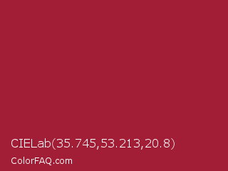 CIELab 35.745,53.213,20.8 Color is a normal red color and the nearest color is Vivid Burgundy #9f1d35. Hex code #a21e36 and RGB value is rgb(162,30,54). In RGB color space, this color is composed of 64% red, 12% green, 21% blue, In CMYK color space, this color is composed of 0% cyan, 81% magenta, 67% yellow , 36% black , In HSL color space, this color has a hue angle of 349° , 69% saturation and 38% lightness.