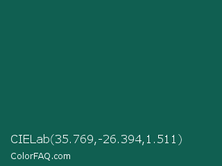 CIELab 35.769,-26.394,1.511 Color is a very dark cyan color and the nearest color is Eden #105852. Hex code #105f51 and RGB value is rgb(16,95,81). In RGB color space, this color is composed of 6% red, 37% green, 32% blue, In CMYK color space, this color is composed of 83% cyan, 0% magenta, 15% yellow , 63% black , In HSL color space, this color has a hue angle of 169° , 71% saturation and 22% lightness.