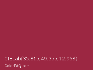 CIELab 35.815,49.355,12.968 Color is a normal red color and the nearest color is Big Dip O Ruby #9c2542. Hex code #9c2742 and RGB value is rgb(156,39,66). In RGB color space, this color is composed of 61% red, 15% green, 26% blue, In CMYK color space, this color is composed of 0% cyan, 75% magenta, 58% yellow , 39% black , In HSL color space, this color has a hue angle of 346° , 60% saturation and 38% lightness.