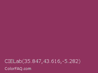 CIELab 35.847,43.616,-5.282 Color is a normal rose color and the nearest color is Boysenberry #873260. Hex code #8f325e and RGB value is rgb(143,50,94). In RGB color space, this color is composed of 56% red, 20% green, 37% blue, In CMYK color space, this color is composed of 0% cyan, 65% magenta, 34% yellow , 44% black , In HSL color space, this color has a hue angle of 332° , 48% saturation and 38% lightness.