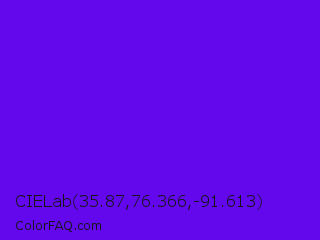 CIELab 35.87,76.366,-91.613 Color is a normal violet color and the nearest color is Electric Indigo #6f00ff. Hex code #6308ed and RGB value is rgb(99,8,237). In RGB color space, this color is composed of 39% red, 3% green, 93% blue, In CMYK color space, this color is composed of 58% cyan, 97% magenta, 0% yellow , 7% black , In HSL color space, this color has a hue angle of 264° , 93% saturation and 48% lightness.