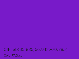 CIELab 35.886,66.942,-70.785 Color is a normal purple color and the nearest color is French Violet #8806ce. Hex code #781ac9 and RGB value is rgb(120,26,201). In RGB color space, this color is composed of 47% red, 10% green, 79% blue, In CMYK color space, this color is composed of 40% cyan, 87% magenta, 0% yellow , 21% black , In HSL color space, this color has a hue angle of 272° , 77% saturation and 45% lightness.