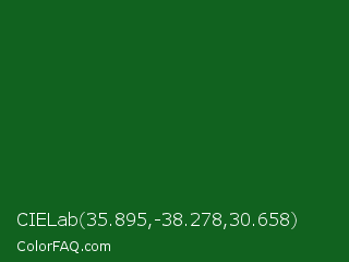 CIELab 35.895,-38.278,30.658 Color is a dark green color and the nearest color is Parsley #134f19. Hex code #11621f and RGB value is rgb(17,98,31). In RGB color space, this color is composed of 7% red, 38% green, 12% blue, In CMYK color space, this color is composed of 83% cyan, 0% magenta, 68% yellow , 62% black , In HSL color space, this color has a hue angle of 130° , 70% saturation and 23% lightness.