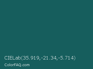 CIELab 35.919,-21.34,-5.714 Color is a dark cyan color and the nearest color is Eden #105852. Hex code #165e5d and RGB value is rgb(22,94,93). In RGB color space, this color is composed of 9% red, 37% green, 36% blue, In CMYK color space, this color is composed of 77% cyan, 0% magenta, 1% yellow , 63% black , In HSL color space, this color has a hue angle of 179° , 62% saturation and 23% lightness.
