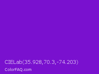 CIELab 35.928,70.3,-74.203 Color is a normal purple color and the nearest color is French Violet #8806ce. Hex code #7911cf and RGB value is rgb(121,17,207). In RGB color space, this color is composed of 47% red, 7% green, 81% blue, In CMYK color space, this color is composed of 42% cyan, 92% magenta, 0% yellow , 19% black , In HSL color space, this color has a hue angle of 273° , 85% saturation and 44% lightness.