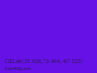 CIELab 35.928,73.464,-87.523 Color is a normal violet color and the nearest color is Han Purple #5218fa. Hex code #6612e6 and RGB value is rgb(102,18,230). In RGB color space, this color is composed of 40% red, 7% green, 90% blue, In CMYK color space, this color is composed of 56% cyan, 92% magenta, 0% yellow , 10% black , In HSL color space, this color has a hue angle of 264° , 85% saturation and 49% lightness.
