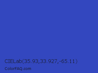 CIELab 35.93,33.927,-65.11 Color is a normal blue color and the nearest color is Violet Blue #324ab2. Hex code #3347bf and RGB value is rgb(51,71,191). In RGB color space, this color is composed of 20% red, 28% green, 75% blue, In CMYK color space, this color is composed of 73% cyan, 63% magenta, 0% yellow , 25% black , In HSL color space, this color has a hue angle of 231° , 58% saturation and 47% lightness.