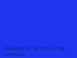 CIELab 35.947,58.973,-92.188 Color is a normal blue color and the nearest color is Palatinate Blue #273be2. Hex code #1d35ee and RGB value is rgb(29,53,238). In RGB color space, this color is composed of 11% red, 21% green, 93% blue, In CMYK color space, this color is composed of 88% cyan, 78% magenta, 0% yellow , 7% black , In HSL color space, this color has a hue angle of 233° , 86% saturation and 52% lightness.