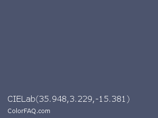 CIELab 35.948,3.229,-15.381 Color is a normal blue color and the nearest color is Independence #4c516d. Hex code #4c546d and RGB value is rgb(76,84,109). In RGB color space, this color is composed of 30% red, 33% green, 43% blue, In CMYK color space, this color is composed of 30% cyan, 23% magenta, 0% yellow , 57% black , In HSL color space, this color has a hue angle of 225° , 18% saturation and 36% lightness.