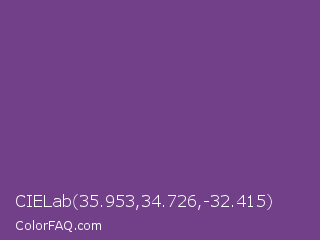 CIELab 35.953,34.726,-32.415 Color is a normal purple color and the nearest color is Affair #714693. Hex code #714089 and RGB value is rgb(113,64,137). In RGB color space, this color is composed of 44% red, 25% green, 54% blue, In CMYK color space, this color is composed of 18% cyan, 53% magenta, 0% yellow , 46% black , In HSL color space, this color has a hue angle of 280° , 36% saturation and 39% lightness.