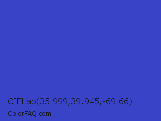 CIELab 35.999,39.945,-69.66 Color is a normal blue color and the nearest color is Cerulean Blue #2a52be. Hex code #3943c7 and RGB value is rgb(57,67,199). In RGB color space, this color is composed of 22% red, 26% green, 78% blue, In CMYK color space, this color is composed of 71% cyan, 66% magenta, 0% yellow , 22% black , In HSL color space, this color has a hue angle of 236° , 56% saturation and 50% lightness.