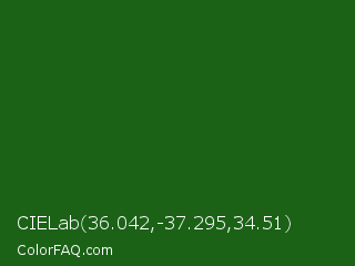 CIELab 36.042,-37.295,34.51 Color is a dark green color and the nearest color is Lincoln Green #195905. Hex code #1b6217 and RGB value is rgb(27,98,23). In RGB color space, this color is composed of 11% red, 38% green, 9% blue, In CMYK color space, this color is composed of 72% cyan, 0% magenta, 77% yellow , 62% black , In HSL color space, this color has a hue angle of 117° , 62% saturation and 24% lightness.