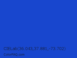 CIELab 36.043,37.881,-73.702 Color is a normal blue color and the nearest color is New Car #214fc6. Hex code #1846ce and RGB value is rgb(24,70,206). In RGB color space, this color is composed of 9% red, 27% green, 81% blue, In CMYK color space, this color is composed of 88% cyan, 66% magenta, 0% yellow , 19% black , In HSL color space, this color has a hue angle of 225° , 79% saturation and 45% lightness.