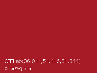 CIELab 36.044,54.416,31.344 Color is a normal red color and the nearest color is Upsdell Red #ae2029. Hex code #a61b26 and RGB value is rgb(166,27,38). In RGB color space, this color is composed of 65% red, 11% green, 15% blue, In CMYK color space, this color is composed of 0% cyan, 84% magenta, 77% yellow , 35% black , In HSL color space, this color has a hue angle of 355° , 72% saturation and 38% lightness.
