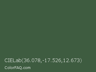 CIELab 36.078,-17.526,12.673 Color is a dark green color and the nearest color is Tom Thumb #3f583b. Hex code #3e5c40 and RGB value is rgb(62,92,64). In RGB color space, this color is composed of 24% red, 36% green, 25% blue, In CMYK color space, this color is composed of 33% cyan, 0% magenta, 30% yellow , 64% black , In HSL color space, this color has a hue angle of 124° , 19% saturation and 30% lightness.