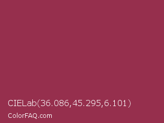 CIELab 36.086,45.295,6.101 Color is a normal rose color and the nearest color is Big Dip O Ruby #9c2542. Hex code #962f4d and RGB value is rgb(150,47,77). In RGB color space, this color is composed of 59% red, 18% green, 30% blue, In CMYK color space, this color is composed of 0% cyan, 69% magenta, 49% yellow , 41% black , In HSL color space, this color has a hue angle of 343° , 52% saturation and 39% lightness.