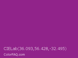 CIELab 36.093,56.428,-32.495 Color is a normal magenta color and the nearest color is Violet Eggplant #991199. Hex code #91238a and RGB value is rgb(145,35,138). In RGB color space, this color is composed of 57% red, 14% green, 54% blue, In CMYK color space, this color is composed of 0% cyan, 76% magenta, 5% yellow , 43% black , In HSL color space, this color has a hue angle of 304° , 61% saturation and 35% lightness.
