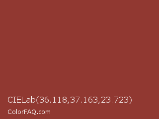 CIELab 36.118,37.163,23.723 Color is a normal red color and the nearest color is El Salva #8f3e33. Hex code #913831 and RGB value is rgb(145,56,49). In RGB color space, this color is composed of 57% red, 22% green, 19% blue, In CMYK color space, this color is composed of 0% cyan, 61% magenta, 66% yellow , 43% black , In HSL color space, this color has a hue angle of 4° , 49% saturation and 38% lightness.