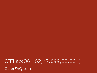 CIELab 36.162,47.099,38.861 Color is a normal red color and the nearest color is Tabasco #a02712. Hex code #9f2a18 and RGB value is rgb(159,42,24). In RGB color space, this color is composed of 62% red, 16% green, 9% blue, In CMYK color space, this color is composed of 0% cyan, 74% magenta, 85% yellow , 38% black , In HSL color space, this color has a hue angle of 8° , 74% saturation and 36% lightness.