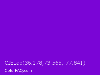 CIELab 36.178,73.565,-77.841 Color is a normal purple color and the nearest color is French Violet #8806ce. Hex code #7a05d6 and RGB value is rgb(122,5,214). In RGB color space, this color is composed of 48% red, 2% green, 84% blue, In CMYK color space, this color is composed of 43% cyan, 98% magenta, 0% yellow , 16% black , In HSL color space, this color has a hue angle of 274° , 95% saturation and 43% lightness.