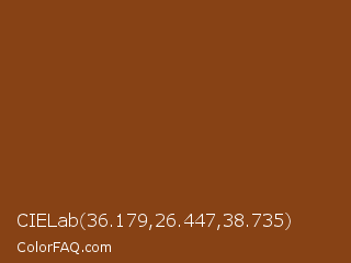 CIELab 36.179,26.447,38.735 Color is a normal orange color and the nearest color is Saddle Brown #8b4513. Hex code #874215 and RGB value is rgb(135,66,21). In RGB color space, this color is composed of 53% red, 26% green, 8% blue, In CMYK color space, this color is composed of 0% cyan, 51% magenta, 84% yellow , 47% black , In HSL color space, this color has a hue angle of 24° , 73% saturation and 31% lightness.