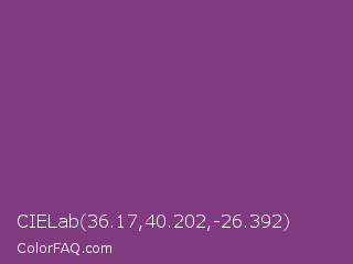 CIELab 36.17,40.202,-26.392 Color is a normal magenta color and the nearest color is Razzmic Berry Crayola #843179. Hex code #7f3a80 and RGB value is rgb(127,58,128). In RGB color space, this color is composed of 50% red, 23% green, 50% blue, In CMYK color space, this color is composed of 1% cyan, 55% magenta, 0% yellow , 50% black , In HSL color space, this color has a hue angle of 299° , 38% saturation and 36% lightness.