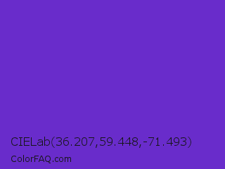 CIELab 36.207,59.448,-71.493 Color is a normal violet color and the nearest color is Purple Heart Crayola #652dc1. Hex code #692ccb and RGB value is rgb(105,44,203). In RGB color space, this color is composed of 41% red, 17% green, 80% blue, In CMYK color space, this color is composed of 48% cyan, 78% magenta, 0% yellow , 20% black , In HSL color space, this color has a hue angle of 263° , 64% saturation and 48% lightness.