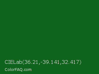 CIELab 36.21,-39.141,32.417 Color is a dark green color and the nearest color is Camarone #00581a. Hex code #10631c and RGB value is rgb(16,99,28). In RGB color space, this color is composed of 6% red, 39% green, 11% blue, In CMYK color space, this color is composed of 84% cyan, 0% magenta, 72% yellow , 61% black , In HSL color space, this color has a hue angle of 129° , 72% saturation and 23% lightness.