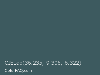 CIELab 36.235,-9.306,-6.322 Color is a normal cyan color and the nearest color is Mineral Green #3f5d53. Hex code #3d5a5f and RGB value is rgb(61,90,95). In RGB color space, this color is composed of 24% red, 35% green, 37% blue, In CMYK color space, this color is composed of 36% cyan, 5% magenta, 0% yellow , 63% black , In HSL color space, this color has a hue angle of 189° , 22% saturation and 31% lightness.
