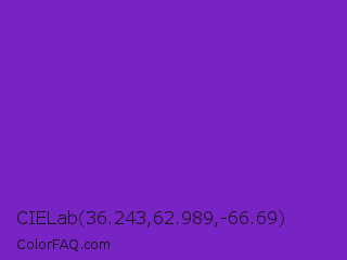 CIELab 36.243,62.989,-66.69 Color is a normal purple color and the nearest color is Purple Heart Crayola #652dc1. Hex code #7823c3 and RGB value is rgb(120,35,195). In RGB color space, this color is composed of 47% red, 14% green, 76% blue, In CMYK color space, this color is composed of 38% cyan, 82% magenta, 0% yellow , 24% black , In HSL color space, this color has a hue angle of 272° , 70% saturation and 45% lightness.