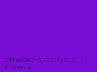 CIELab 36.245,72.337,-77.741 Color is a normal purple color and the nearest color is French Violet #8806ce. Hex code #780dd6 and RGB value is rgb(120,13,214). In RGB color space, this color is composed of 47% red, 5% green, 84% blue, In CMYK color space, this color is composed of 44% cyan, 94% magenta, 0% yellow , 16% black , In HSL color space, this color has a hue angle of 272° , 89% saturation and 45% lightness.