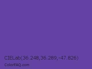 CIELab 36.248,36.289,-47.826 Color is a normal indigo color and the nearest color is Royal Purple #6b3fa0. Hex code #6242a3 and RGB value is rgb(98,66,163). In RGB color space, this color is composed of 38% red, 26% green, 64% blue, In CMYK color space, this color is composed of 40% cyan, 60% magenta, 0% yellow , 36% black , In HSL color space, this color has a hue angle of 260° , 42% saturation and 45% lightness.