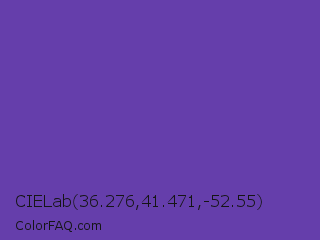 CIELab 36.276,41.471,-52.55 Color is a normal violet color and the nearest color is Royal Purple #6b3fa0. Hex code #653eab and RGB value is rgb(101,62,171). In RGB color space, this color is composed of 40% red, 24% green, 67% blue, In CMYK color space, this color is composed of 41% cyan, 64% magenta, 0% yellow , 33% black , In HSL color space, this color has a hue angle of 261° , 47% saturation and 46% lightness.